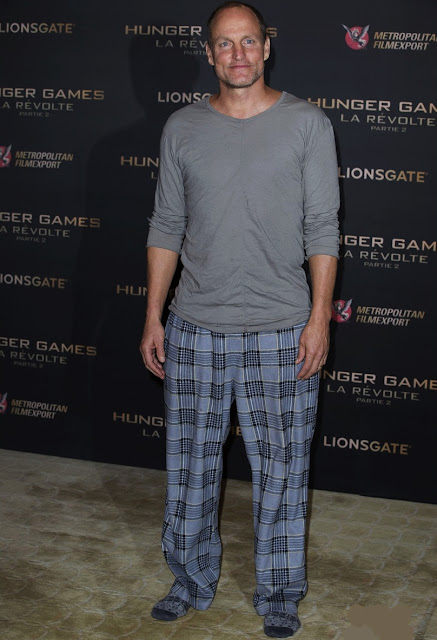 La actriz de 25 años de edad, ganadora del Oscar posó con sus compañeros de reparto Liam Hemsworth, Josh Hutcherson, y Woody Harrelson, el último de los cuales no llevaba zapatos y se presentó en pantalones de pijama!